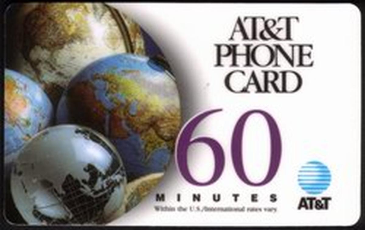 This card is part of the Earth Globes series, specifically referencing the number “60m” which identifies its capacity. The presence of the AT&T name and logo confirms it is a collectible promotional phone card issued by AT&T, representing international or global telecommunication themes.