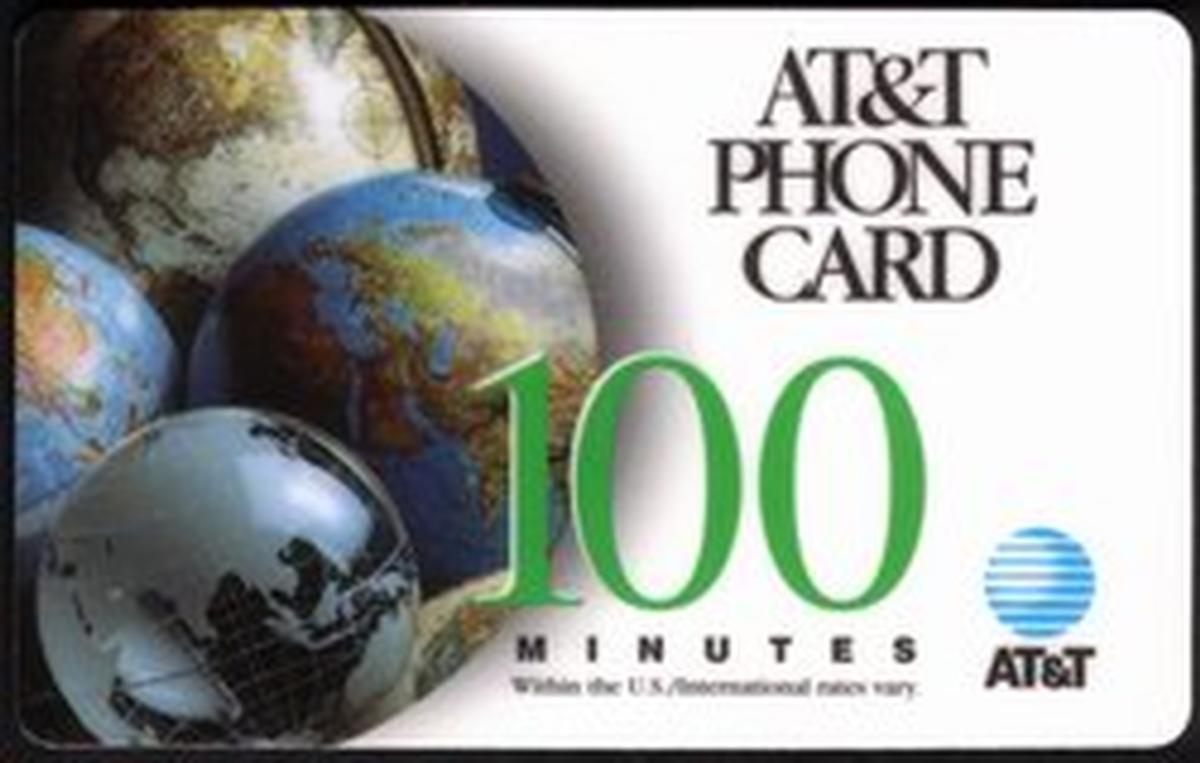 This collectible AT&T Phone Card features imagery and themes focused on Earth globes, highlighting the global telecommunications theme associated with AT&T. The card presents a view of multiple stylized globes arranged dynamically against a background with gradient shades of blue and white. The prominent AT&T logo is displayed clearly on the card, reinforcing the brand identity.