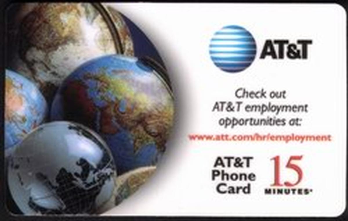 This collectible phone card features a detailed image of earth globes on its front side, with the text "Check Out AT&T Employment..." prominently displayed. The phrase “AT&T Phone Card” appears clearly, identifying the card as an AT&T promotional phone card. The card has a value indicated as "15m," representing 15 minutes of prepaid telephone time. The design incorporates a modern style with the globes symbolizing global communication, emphasizing the worldwide reach of AT&T’s phone services.