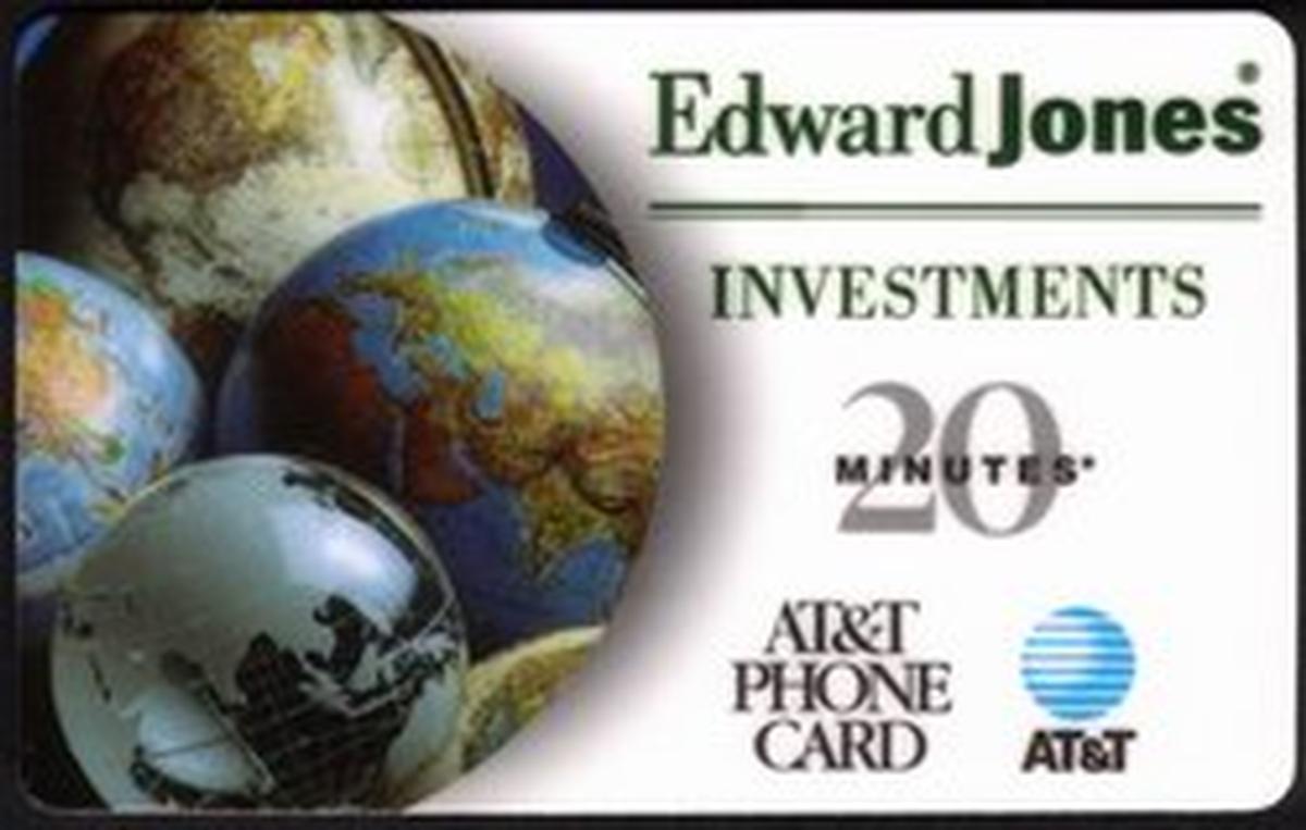 The card prominently displays the Edward Jones Investments logo in the bottom right corner, identifying the card as a promotional item associated with Edward Jones. The text “20m Edward Jones Investments (World Globes)” is printed along the lower portion of the card, indicating its specific title and possibly its value or series designation. Along the top edge, the AT&T logo appears alongside the word “SPECIMEN,” linking the card to AT&T.