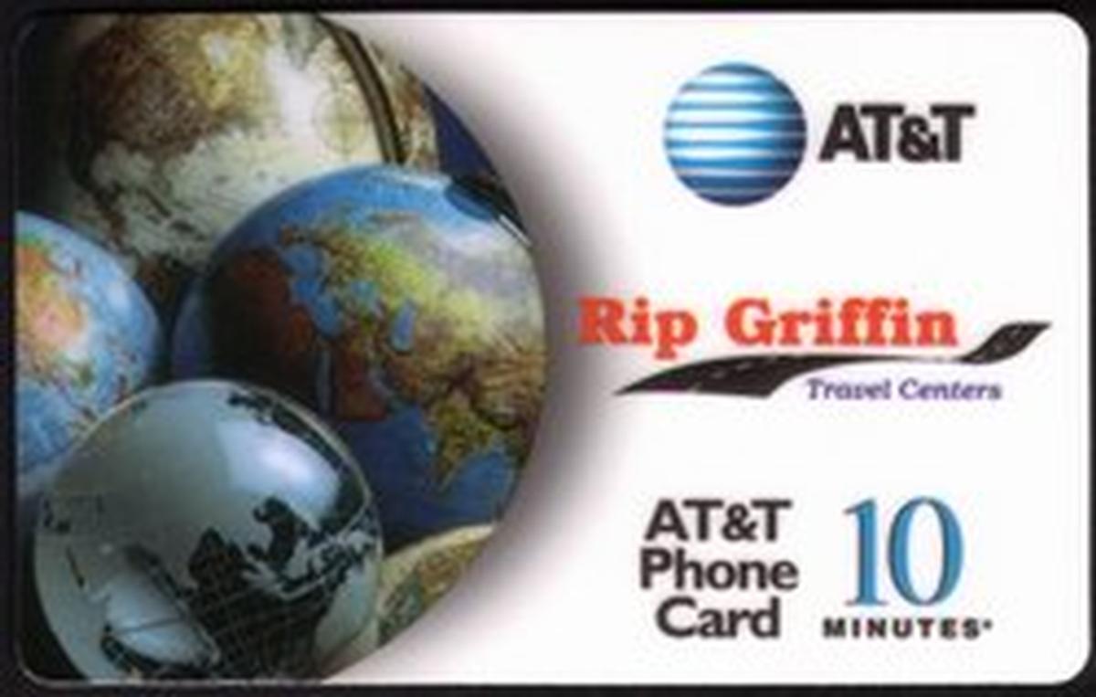 The design incorporates a blue and purple gradient backdrop, with the globes shown in vibrant blue tones, creating a visually appealing contrast. The Rip Griffin Travel Centers branding ties the card to travel-related retail or service locations. The layout is clean, with the main elements spread evenly across the card’s surface. The card’s dimensions and style suggest it is intended for use as a prepaid phone card to make telephone calls.