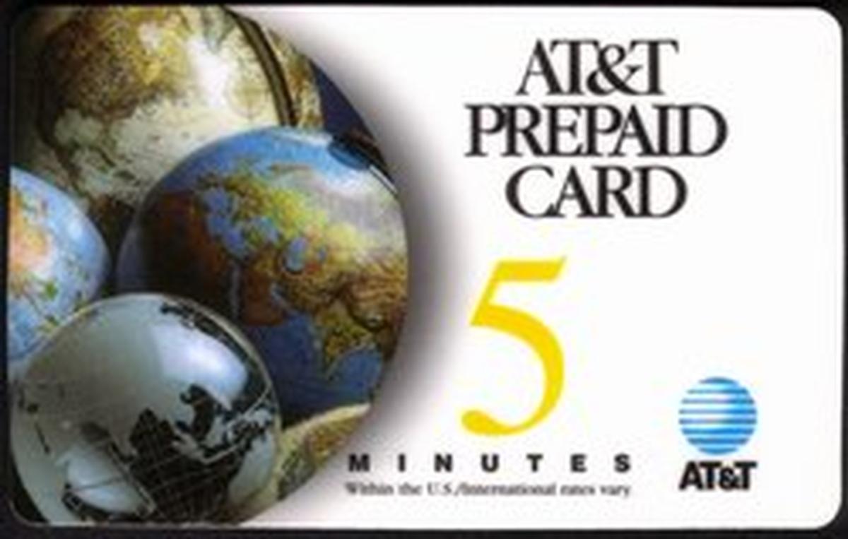 The AT&T Prepaid Card features a design centered around the theme of Earth globes. The front of the card displays multiple images of the planet Earth, each portrayed as a globe with detailed continents and oceans. The globes are rendered in a clean and vibrant style, showing various views of the world. The design includes five Earth globes arranged prominently, emphasizing a global or international concept.