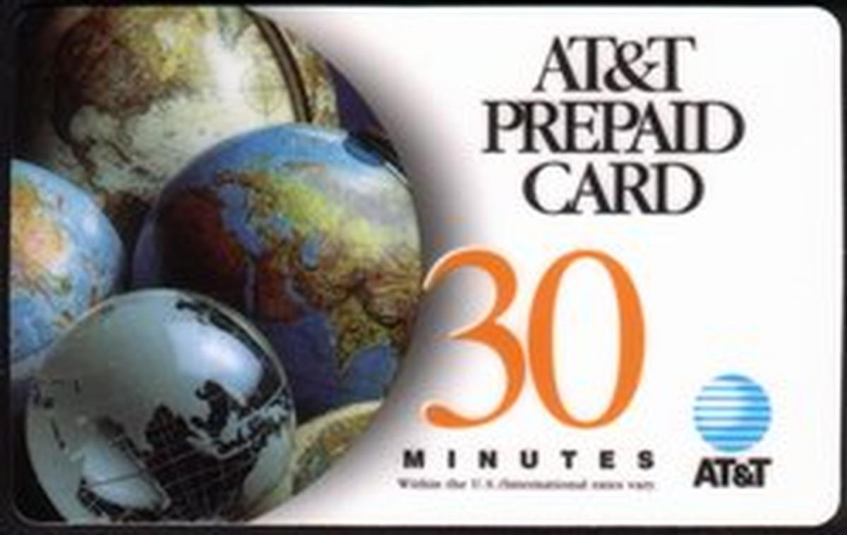 This collectible promotional phone card features a detailed image of Earth globes measuring 30 meters. The card is branded with the AT&T logo and prominently displays the text "AT&T Prepaid Card," indicating its use as a prepaid calling card. The design centers on the depiction of multiple world globes, offering a visual emphasis on global connectivity or communication, consistent with AT&T’s telecommunications branding.