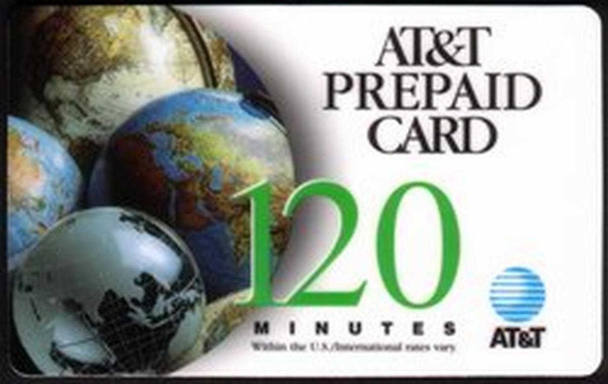 The card’s layout includes the denomination of 120 meters, indicating the amount of prepaid calling time available for use. The globe imagery reflects the worldwide reach of AT&T’s prepaid phone services. The card is part of a promotional issue, designed for collectors or prepaid phone users who benefit from international communication options. The use of clean typography and the AT&T brand name establishes its authenticity and corporate identity.