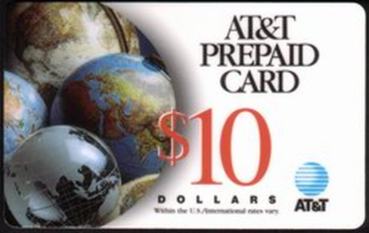 The card’s denomination of "$10" is located in the bottom right corner in blue letters, clearly denoting the prepaid card’s value. The overall presentation highlights the theme of world globes, providing a nod to global communication fitting for AT&T’s branding. The combination of the brand name, card value, and globe imagery makes this card a distinctive collectible item from AT&T.