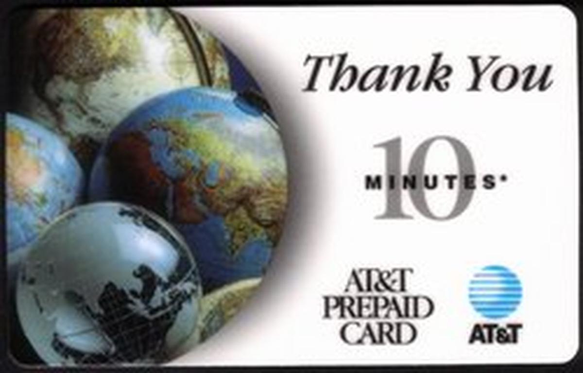 This promotional card links to the theme of worldwide connections through its detailed Earth globes and the AT&T branding. The card does not contain any other text or imagery beyond what relates to the AT&T Prepaid Card, the Thank You message, and the Earth globes design.