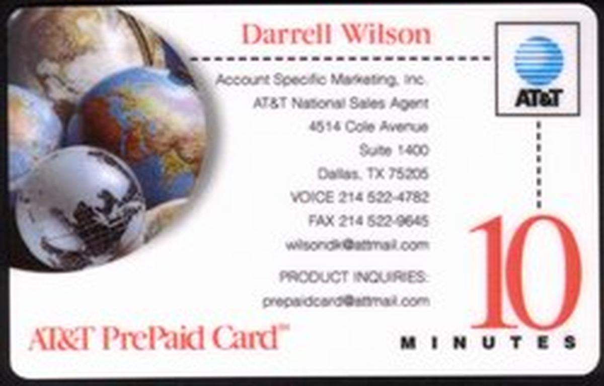 The card includes the name Darrell Wilson, identified as an AT&T national sales agent with a 10 million account specific marketing designation, reinforcing its promotional and business card nature. The text “AT&T Prepaid Card” is also visible, associating the card with AT&T prepaid services. The layout and color scheme predominantly include shades of blue and white, aligning with AT&T’s corporate colors.