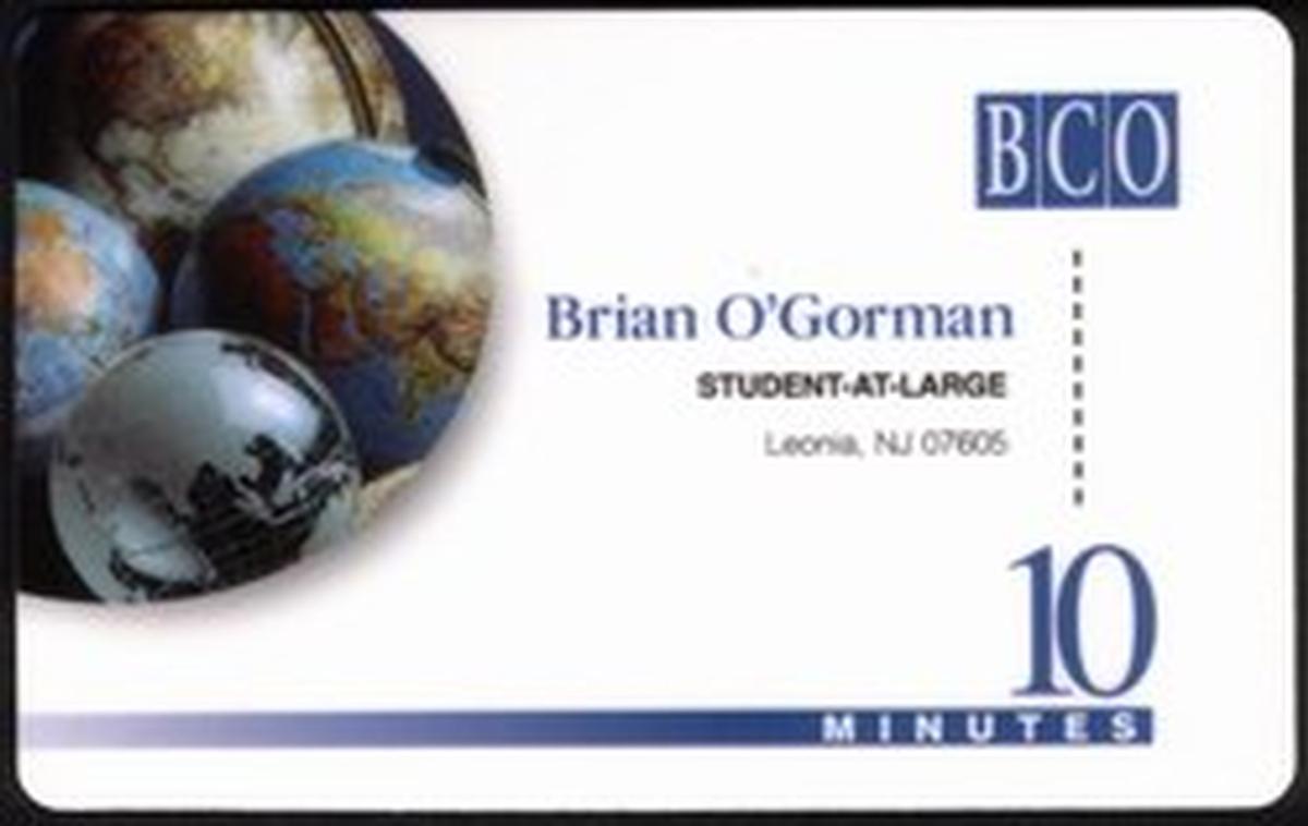 Printed text on the card includes "Leonia NJ 07605" and the name "Brian O'Gorman," alongside the designation "Student-At-Large (World Globes)." The card also bears the markings "BCO," "SPECIMEN," and "AT&T," confirming its association with AT&T’s promotional phone card series. The design presents a clean, professional layout with clear, readable typography overlaying the globe imagery.