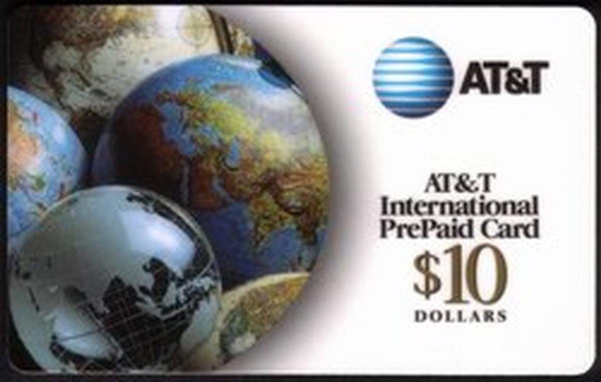 The card includes the AT&T logo, which is a blue circle with white horizontal stripes, positioned on the right side next to one of the globes. The layout, colors, and typography reinforce the card’s function as a prepaid international calling card issued by AT&T.
