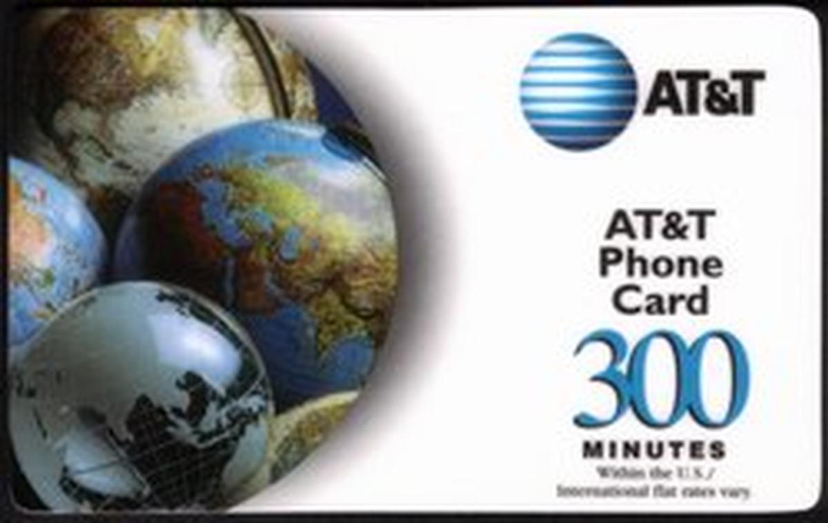 This collectible AT&T phone card features a vibrant design of Earth globes viewed from space, highlighting planetary imagery with a focus on the blue and green colors representing the Earth. The card prominently displays the AT&T logo and includes the text “300m,” indicating the card’s value or unit. The design emphasizes the theme of global communication and connectivity, consistent with AT&T’s branding.