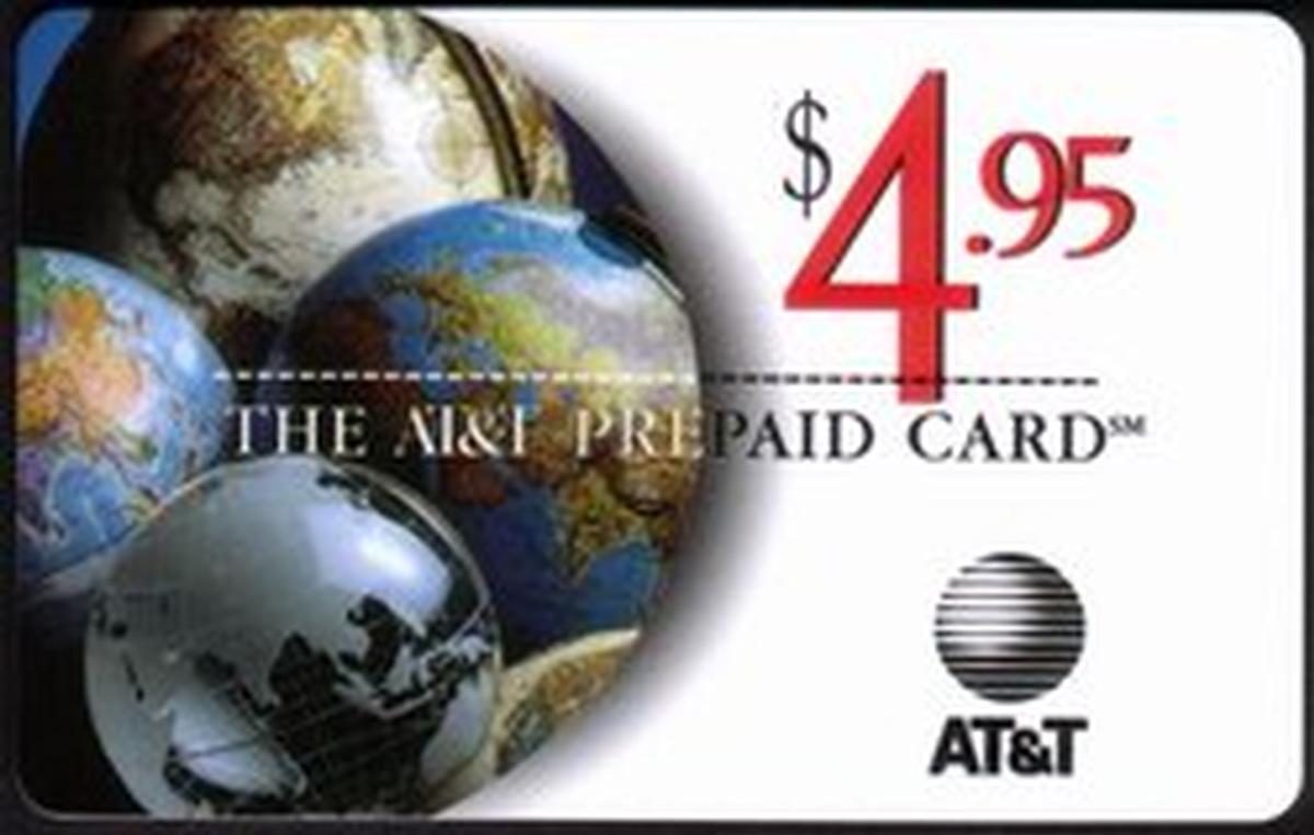 The card displays the text “$4.95” clearly above the top globe, indicating its prepaid value. In the top-right corner, the AT&T logo is present, consisting of the company’s recognizable blue globe with white curved lines, reinforcing the card’s association with the AT&T brand. The text “AT&T Prepaid Card” appears next to the logo, confirming that this is a prepaid calling card issued by AT&T.