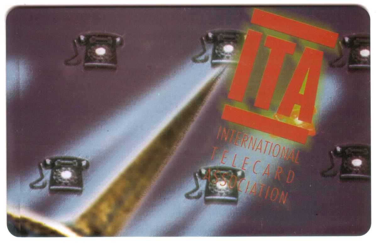 The card bears historical associations with telecommunication and phone card collection, specifically connected to the International Telecard Association, which is mentioned in the keywords related to the 1997 ITA Telecard Foundation Inaugural Dinner. No other logos or text appear on the front of the card besides the telephones and the ITA logo.