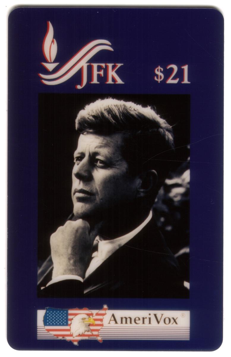 Issued by AmeriVox, this card is part of a collectible series honoring U.S. Presidents and notable political figures, specifically highlighting John F. Kennedy’s impact and standing in American history. The overall aesthetic uses a dark blue color palette to convey a respectful and dignified tone consistent with the subject’s importance.