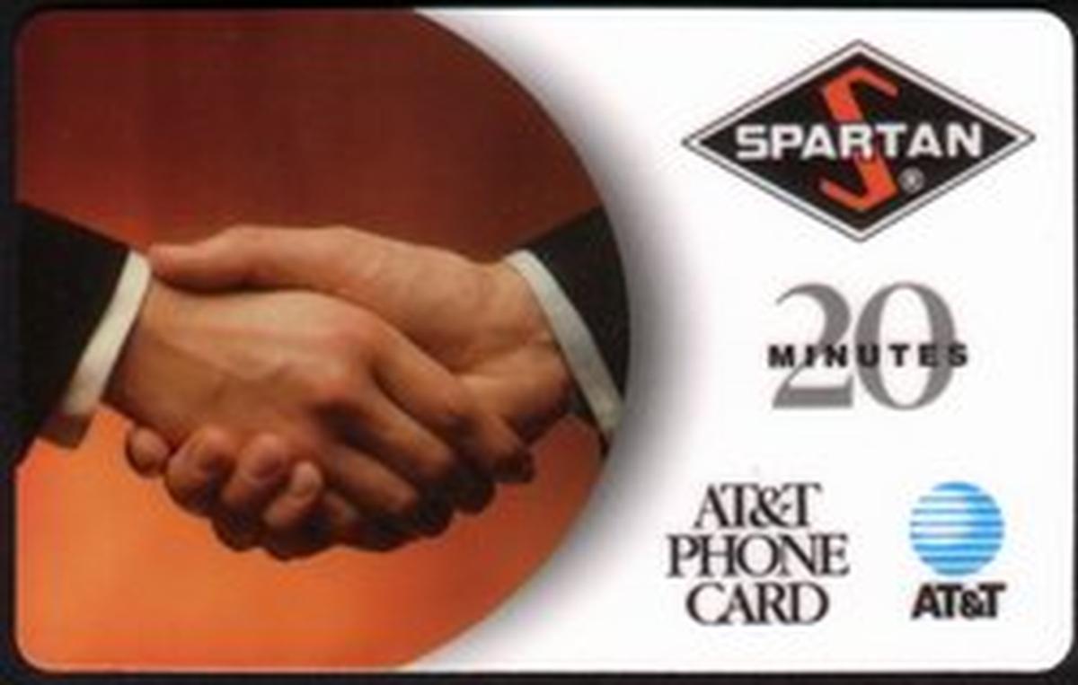The card carries the AT&T logo on the top right corner, indicating the telecom company associated with this phone card. The overall design emphasizes the handshake as a symbol of cooperation or a business deal, highlighting a connection with Spartan Motors and the number 20m, likely referring to a 20 million milestone or a 20-meter scale related to the brand.