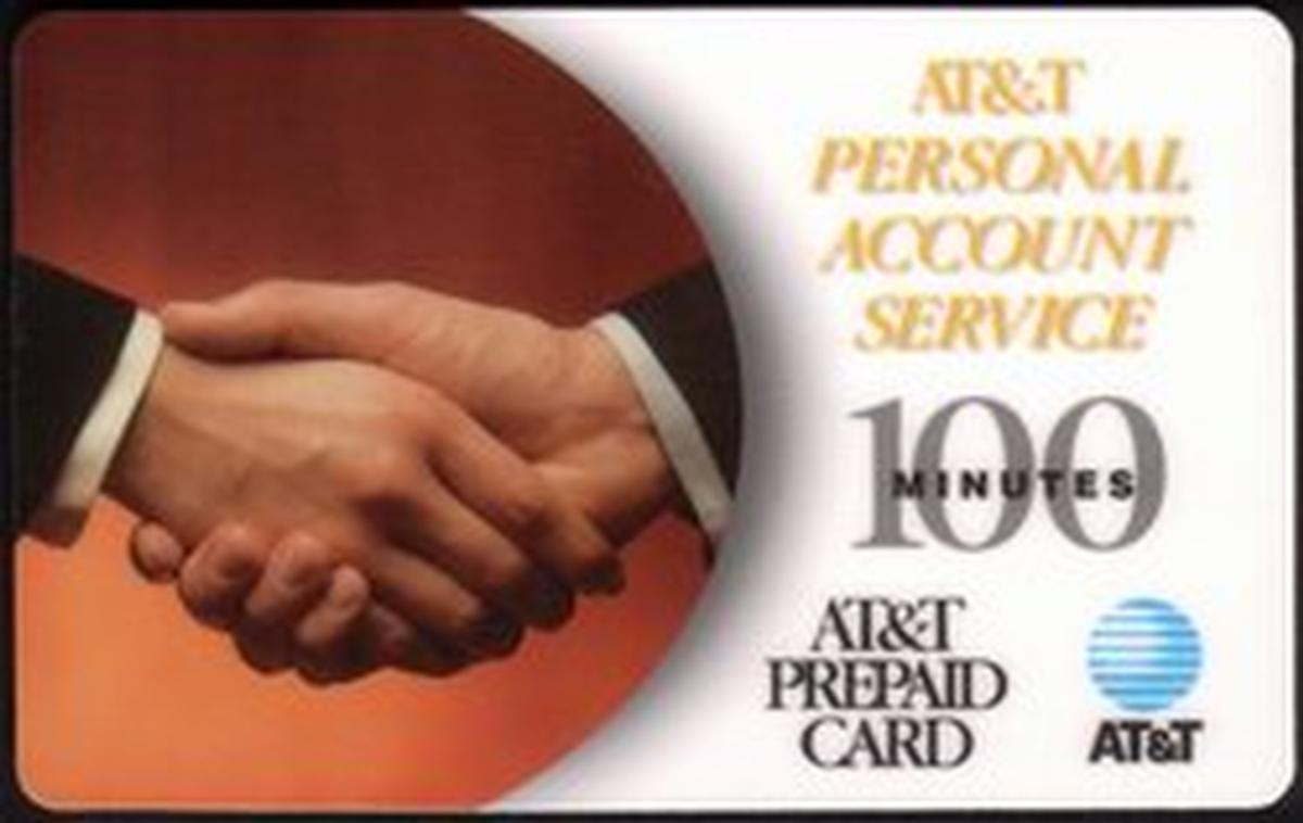 This card is a collectible promotional item issued by AT&T, emphasizing the company's 100-minute personal account phone service. The handshake graphic visually reinforces the theme of connection and communication associated with AT&T’s telecommunication services.