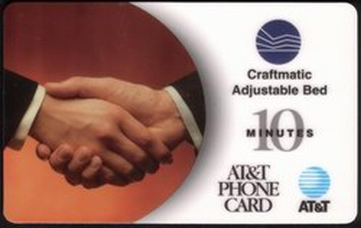 This collectible phone card features a promotional design for Craftmatic Adjustable Beds, highlighting the 10-minute adjustable bed setting. The main visual element shows two people shaking hands on the left side of the card, symbolizing agreement or partnership. The AT&T logo is clearly visible, confirming the card’s association with the telecommunications company.