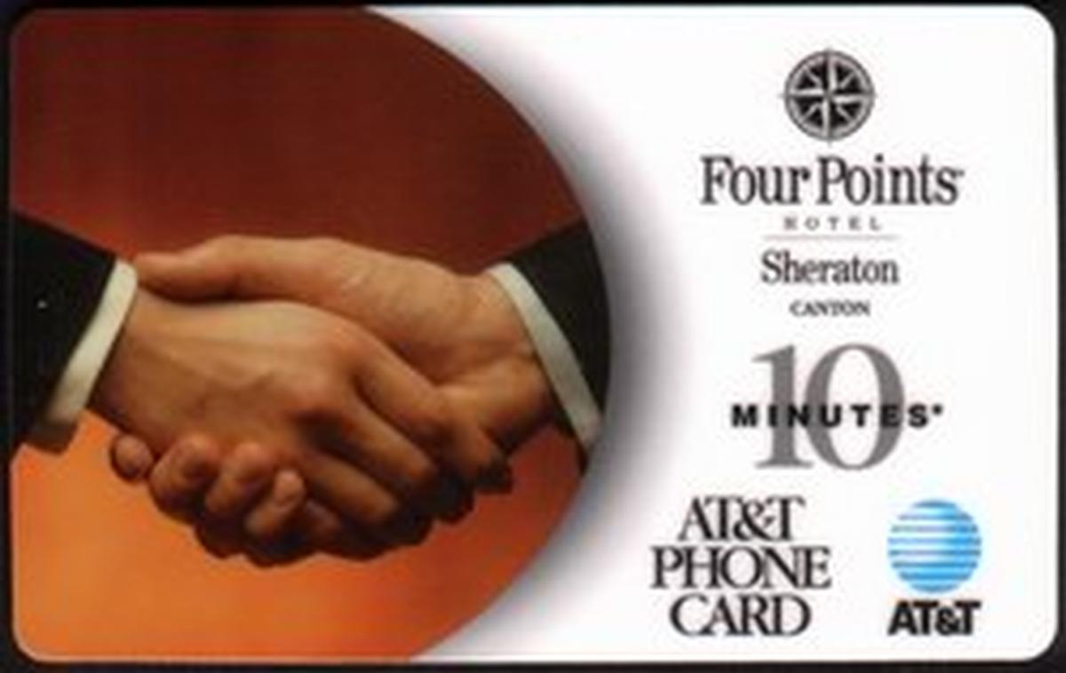 This collectible promotional phone card features imagery related to Canton, Ohio, and specifically highlights the Four Points Hotel Sheraton. The design prominently shows two men shaking hands on the left side of the card, symbolizing partnership or agreement. The top right corner contains the AT&T logo as well as the denomination, marked as "10m," indicating its value for telecommunications use.