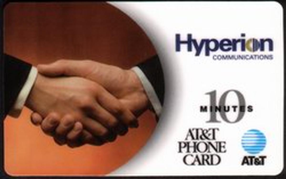 This collectible phone card features a promotional 10-meter value issued by Hyperion Communications. The design prominently displays two hands shaking on the left side, symbolizing partnership or agreement. The card is identified with the AT&T name in the artwork, reinforcing its association with telecommunications services.