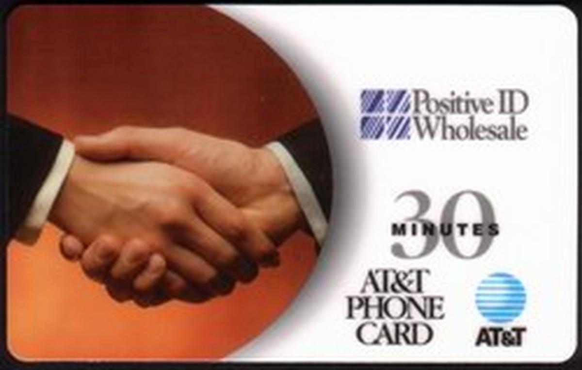 Near the bottom right corner, the card is marked with the words "PROMOTIONAL" and "SPECIMEN" in all capital letters. The text "Positive ID Wholesale" appears just below the handshake image, styled in a simple and clear font. The overall design uses a blue and white color scheme with sharp contrasts to highlight key elements such as the AT&T branding and the card’s value.
