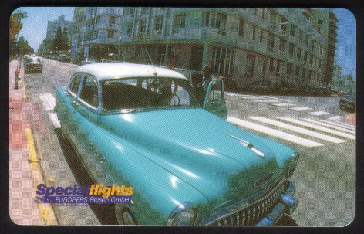 The card's layout incorporates the standard elements of a collectible phone card, including a chip embedded near the left edge. The design emphasizes travel and automobiles from Germany, tying together the motifs of classic cars and European journeys. The overall style balances retro automotive imagery with modern graphic elements, making it appealing to collectors interested in automobiles and German travel culture.