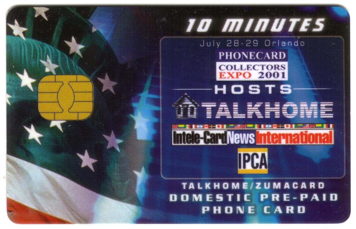 This collectible phone card is a 10-minute domestic pre-paid card issued for the Phonecard Collectors Expo 2001 held on July 28-29 in Orlando. The card prominently displays the event details, including the hosting entity, TalkHome, which is presented with a house-like logo to the left of the name. Below the host name are logos and text referencing Intele-Card News International, IPCA, and the ZumaCard brand, indicating partnerships or sponsorships related to the expo.