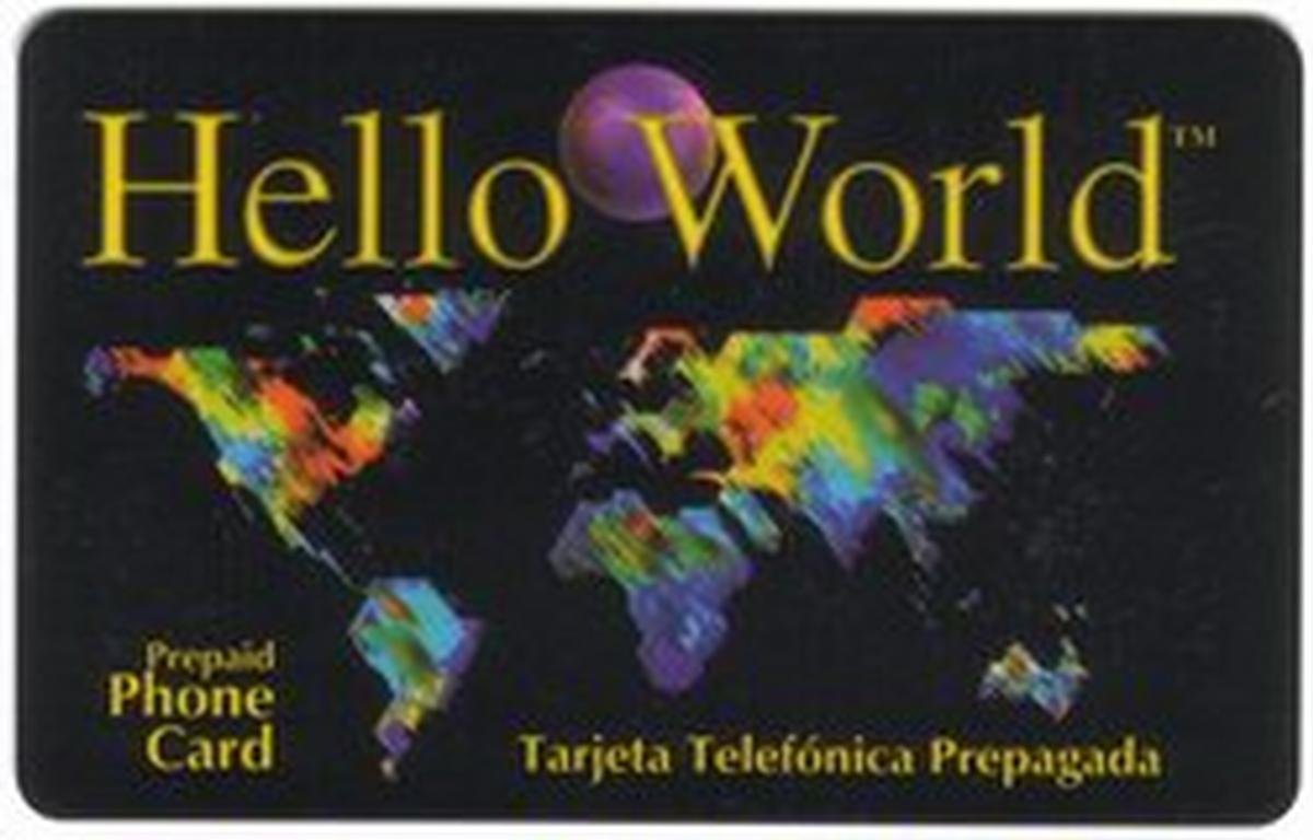 The card’s layout uses a red text reverse style for the main "Hello World" logo, making it stand out against the colorful globe image. This card is a collectible item associated with global connectivity themes, emphasizing the concept of communication around the world.