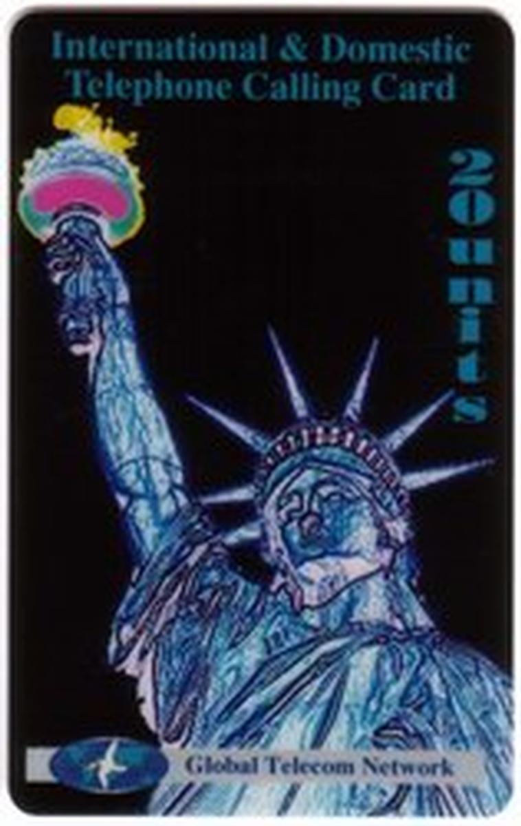 The card includes branding elements for Global Telecom Network and WorldCom, indicating its use within telecommunications services. The design integrates artistic elements with clear references to American historical landmarks and the cultural symbolism of the Statue of Liberty. Minor imperfections are noted in the artwork, but the overall presentation maintains a focus on the monument’s iconic status.