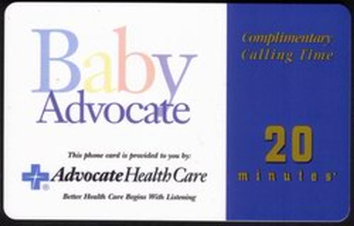 This collectible phone card is a promotional item from AT&T, featuring the theme "Better Health Care Begins With Listening." It includes the phrase "Baby Advocate Health Care '... Begins With Listening'" prominently on the card. The card is marked as a 20-meter specimen, indicating its usage value.