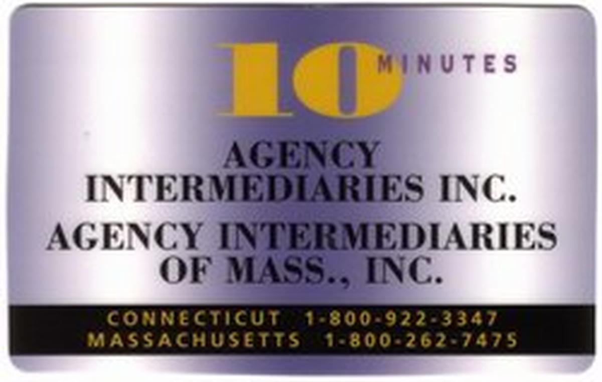 Additional text on the card includes "PROMOTIONAL" in uppercase letters near the top center. The location "Massachusetts" is printed underneath “Agency Intermediaries Inc.,” specifying the relevant region associated with the card. The overall layout is clean and corporate in appearance, consistent with a promotional phone card issued by AT&T.