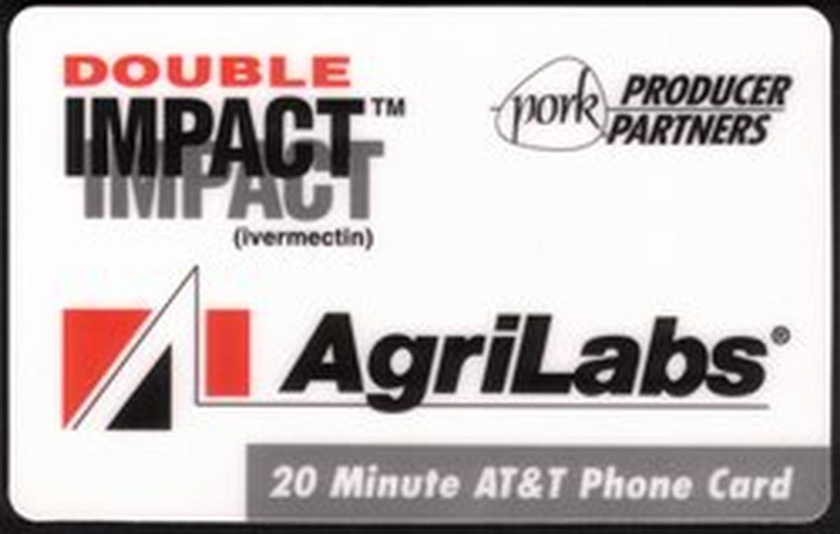 The overall design blends agricultural themes with corporate branding, linking the pigs and pork production message directly to AgriLabs and AT&T. The card’s layout is clean, with clear text placement and detailed photographic imagery of the animals, focusing on the role of this ivermectin product within pork farming industries.