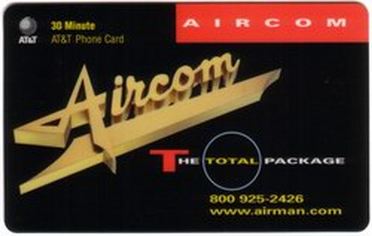 In the bottom right corner, the AT&T logo is printed along with the word "SPECIMEN." This confirms the card’s association with AT&T telecommunications and indicates that it is a sample or demonstration card rather than one meant for active service. The overall layout is clean and professional, designed to promote Aircom’s services within a collectible phone card format.