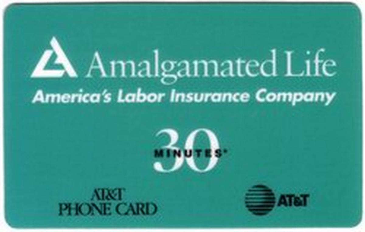 This collectible card features promotional artwork for Amalgamated Life, branded as "America's Labor Insurance Company." The card clearly displays the Amalgamated Life logo alongside the text "Life Insurance 30m," indicating a 30-minute usage or value related to this promotion. The word "SPECIMEN" is prominently shown, marking this card as a sample or demonstration piece. The design incorporates the AT&T logo, placing the card within the context of telecommunications services provided or supported by AT&T.