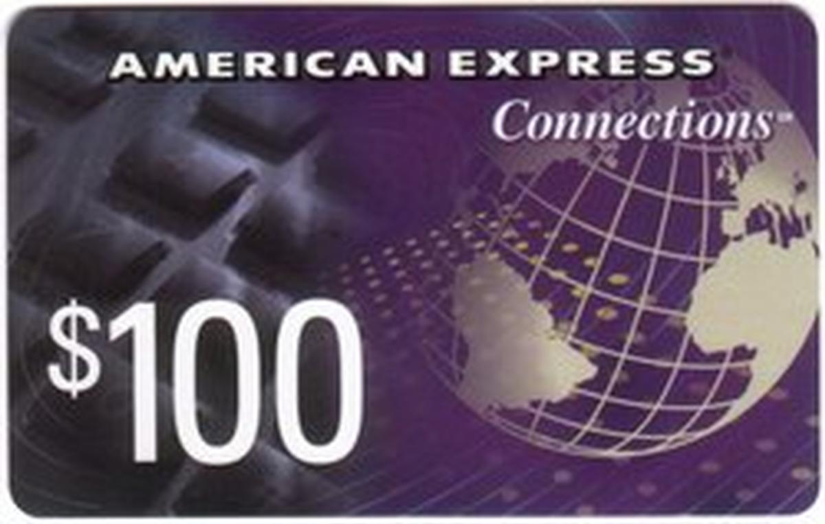 The combination of the rotary phone, numeric keypad, globe, and telephone company logos clearly ties this piece to the world of collectible phone cards, specifically promoting telecommunications services. The value of $100 and the American Express Connections name identify it as a prepaid phone card, usable for making calls, with a design aimed at collectors and users familiar with both American Express and AT&T brands.