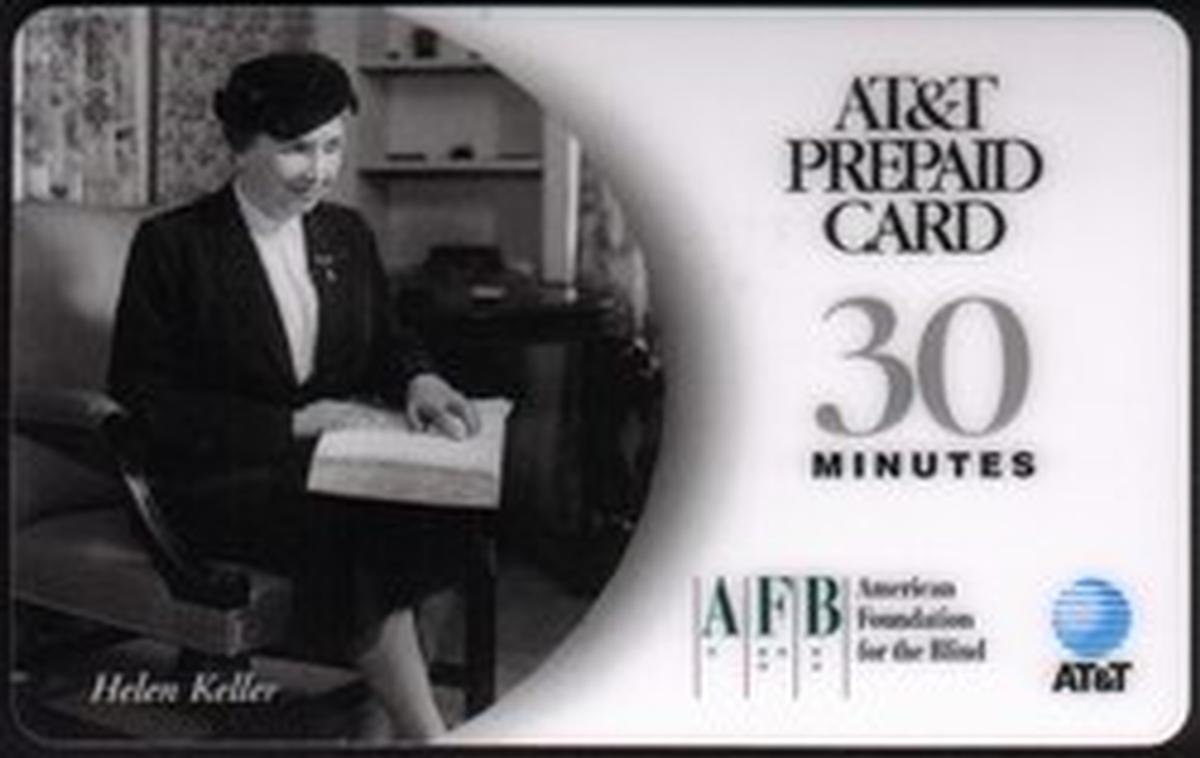 This collectible promotional phone card features a prominent photographic portrait of Helen Keller, an influential figure associated with the American Foundation for the Blind. The card is issued by AT&T and includes braille text, emphasizing accessibility for visually impaired users. The value indicated on the card is "30m," denoting 30 minutes of phone usage time.
