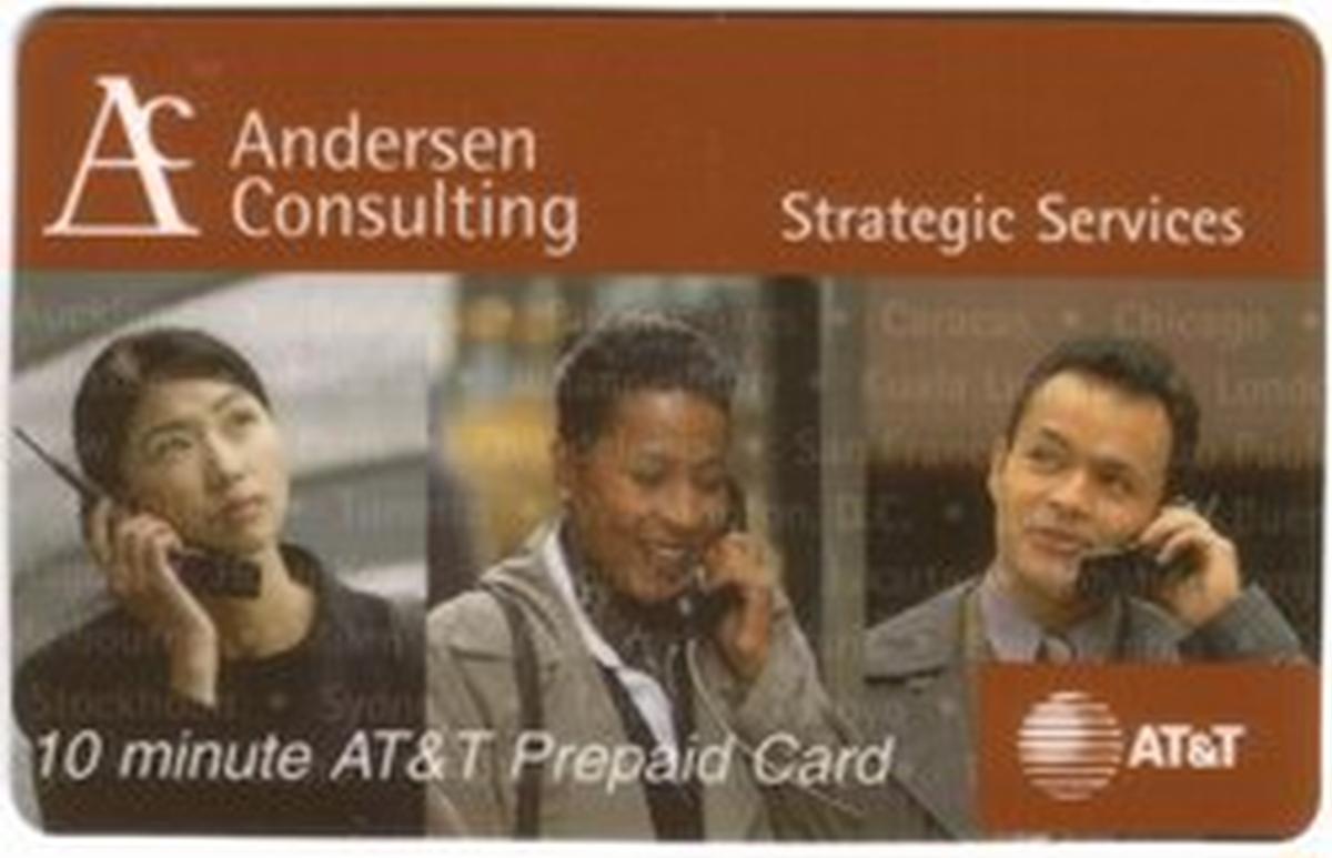 The card includes the phrase "10m Andersen Consulting 'Strategic Services'" indicating a prepaid call value of 10 minutes. It also clearly shows the AT&T logo along with “SPECIMEN” printed on the card. The design emphasizes corporate branding and the technological theme of phones used on phone cards. The card’s color scheme and arrangement of text and images maintain a professional and businesslike appearance.
