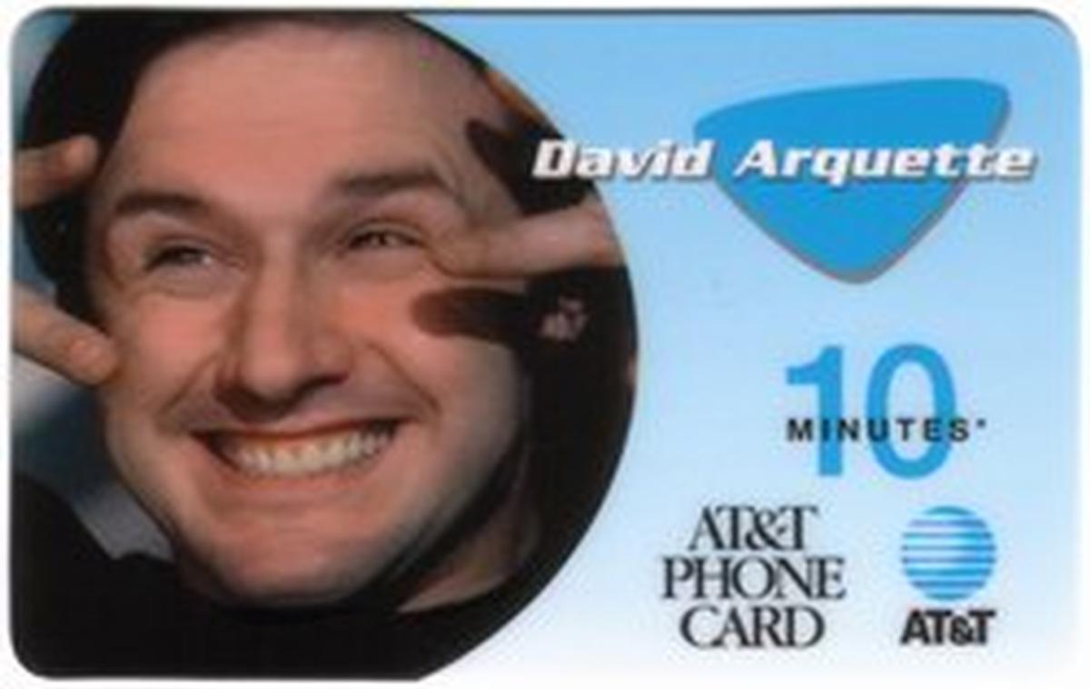 The card prominently displays the AT&T logo in the upper left corner with the word "SPECIMEN" written vertically along the right edge. The value of the card is shown as "10m" on the right side, indicating its phone credit. The overall design is simple and focused, emphasizing David Arquette’s image and the AT&T branding.