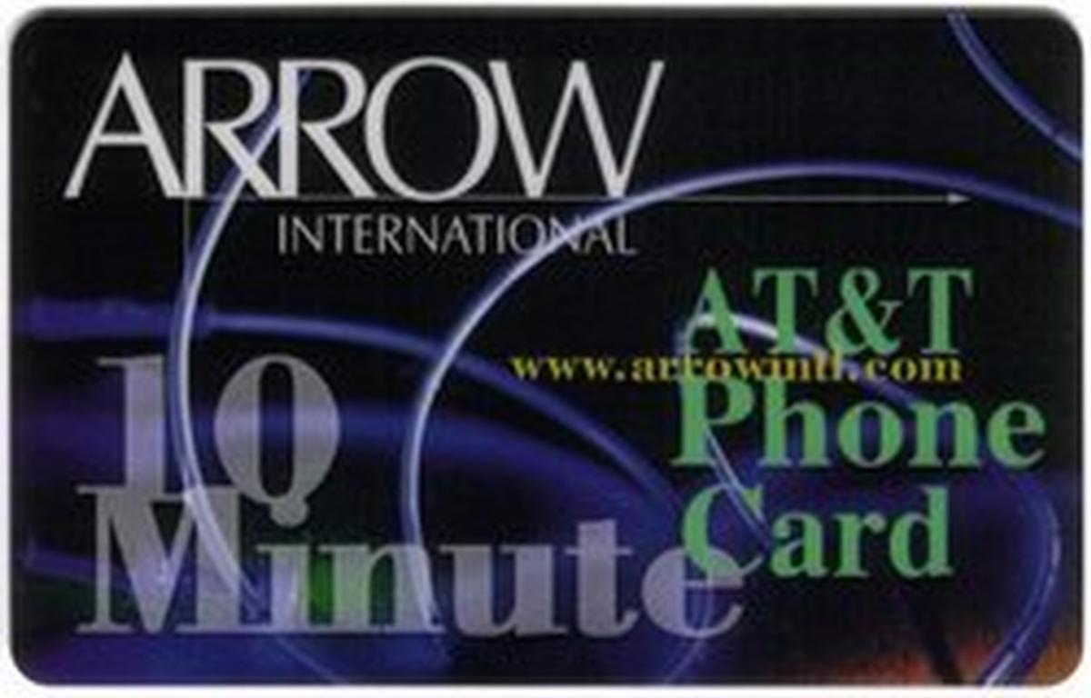 The card is produced by Arrow International, referenced directly on the card, a company known for manufacturing phone cards. The presentation and markings establish the card as part of AT&T’s international calling phone card offerings. No additional graphics or characters appear on the front of the card besides the text and corporate logos.