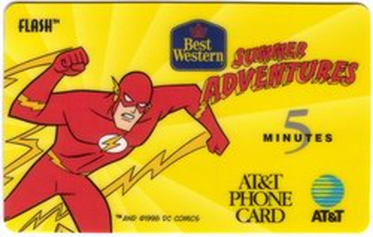 Overall, the card combines comic book art with corporate branding from AT&T and WorldCom, making it a collectible piece that highlights The Flash as part of a promotional series tied to DC Comics and Best Western’s summer-themed adventures.