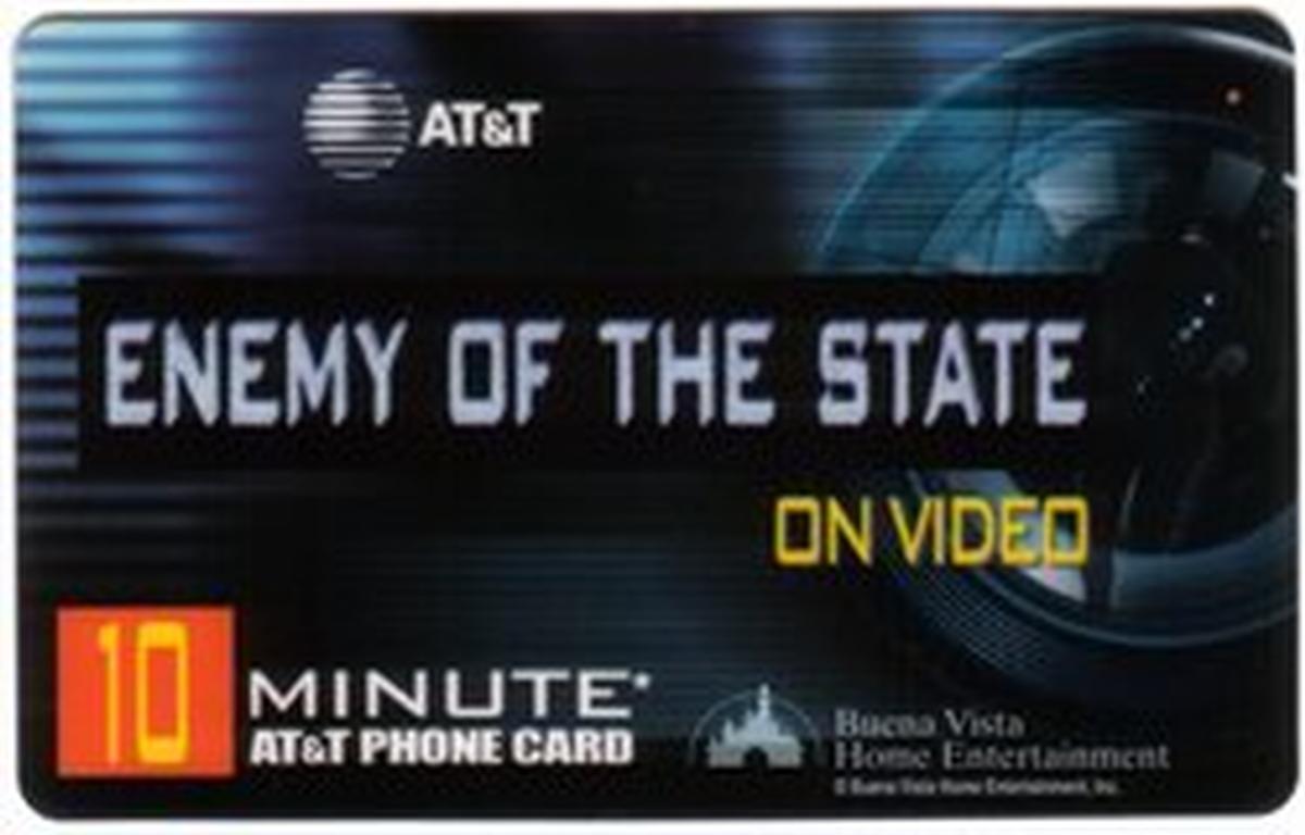 This card is part of a series of collectible phone cards issued by AT&T, serving as a promotional item for the 1998 thriller *Enemy of the State*. The overall presentation reflects a formal and official promotional collectible intended for fans and collectors of movie memorabilia and phone cards.