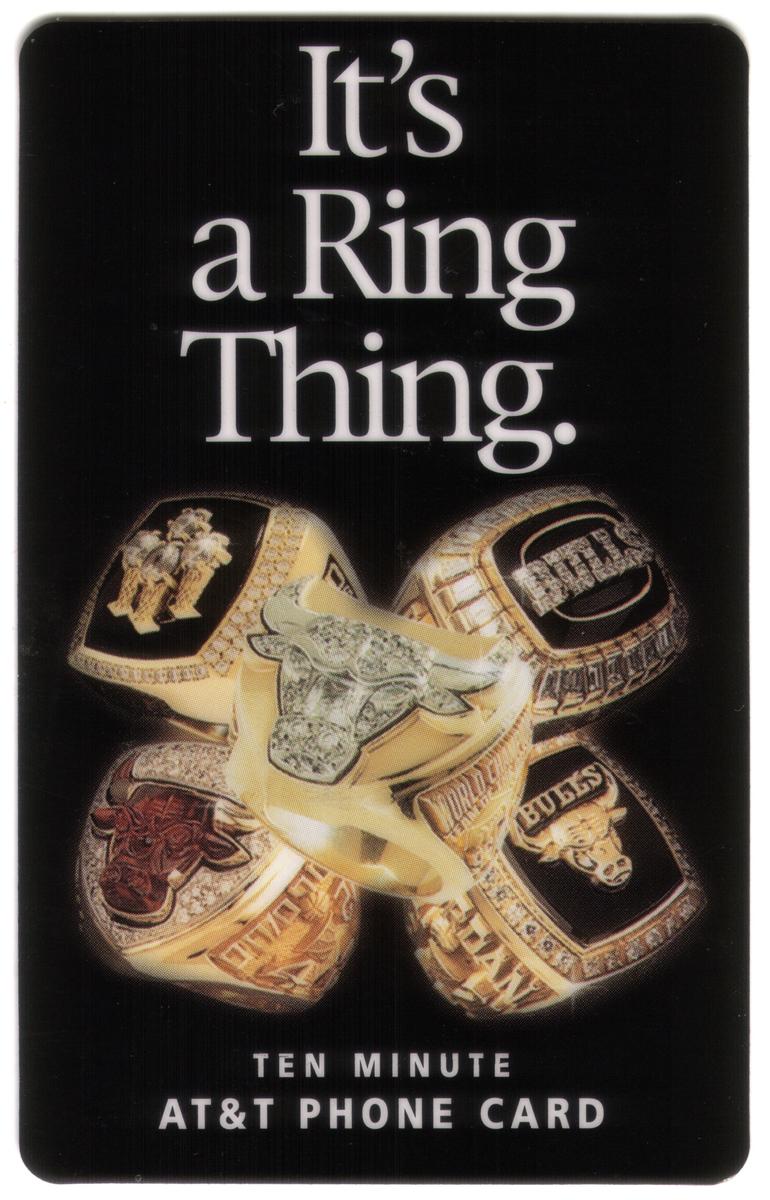 Overall, the card honors the Chicago Bulls basketball team’s championship heritage and acts as a collectible item tied to AT&T’s promotional campaign. Its graphic elements highlight the iconic Bulls logo, the championship ring, and related basketball motifs in a visually striking manner.