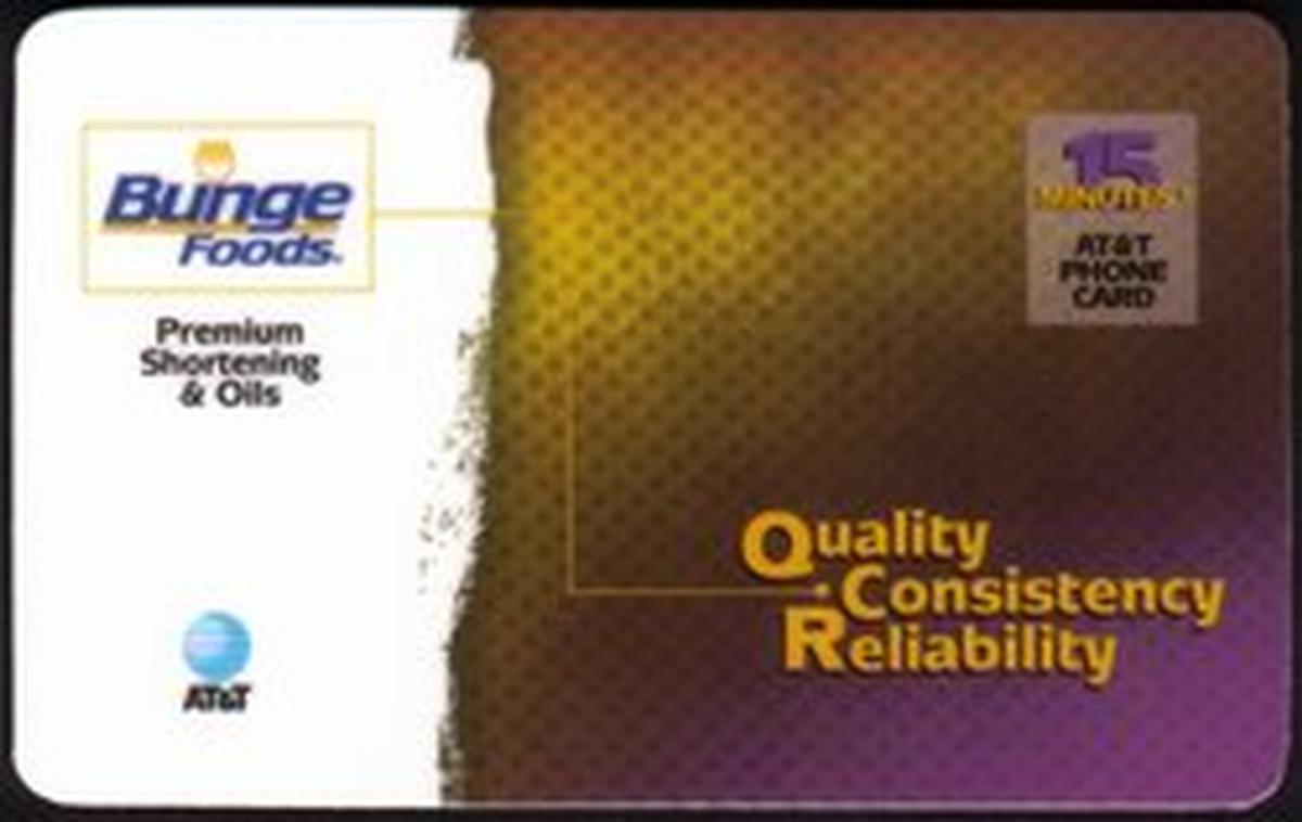This collectible phone card represents a promotional piece combining telecommunications and food industry branding. It highlights AT&T’s role and the Bunge Foods product category of premium shortening and oils, embodying a partnership designed to convey professionalism and trust. The word “Specimen” indicates the card is a sample or example used for display or collection purposes.
