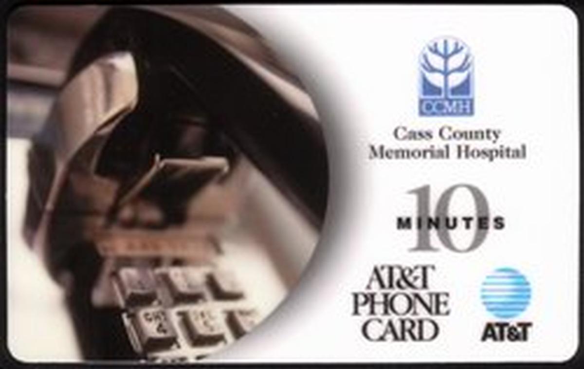 The overall design is promotional in nature, linking the telephones with Cass County Memorial Hospital located in Iowa. The card’s visual emphasis on telephones and the clear mention of the hospital highlights its intended use or commemoration related to that facility. The AT&T logo and the word "SPECIMEN" confirm this as a specimen example of a phone card linked to telephone usage and service.