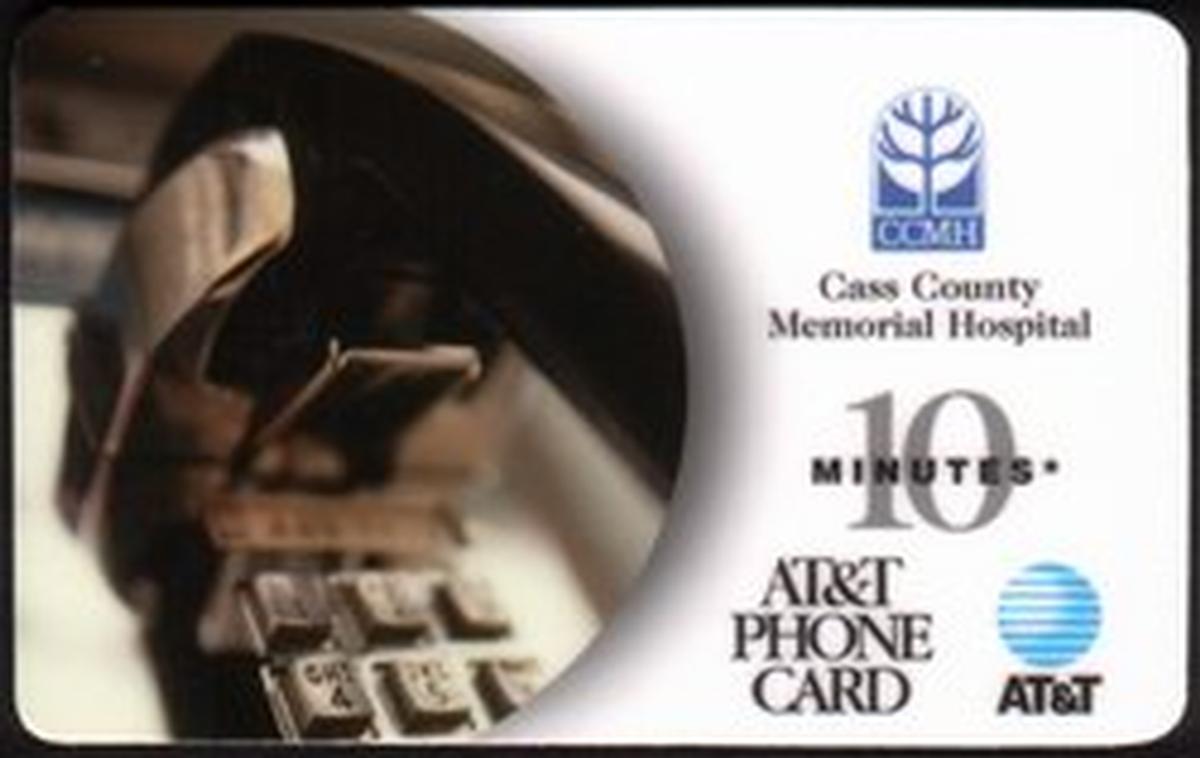 The visual elements on the card focus on telephones, aligning with the theme of phone cards and telephone usage. The overall design suggests a promotional purpose, likely highlighting aspects of telephone communication connected to Cass County Memorial Hospital. The colors and layout are clean and straightforward, emphasizing the text and logos without additional imagery or decoration.