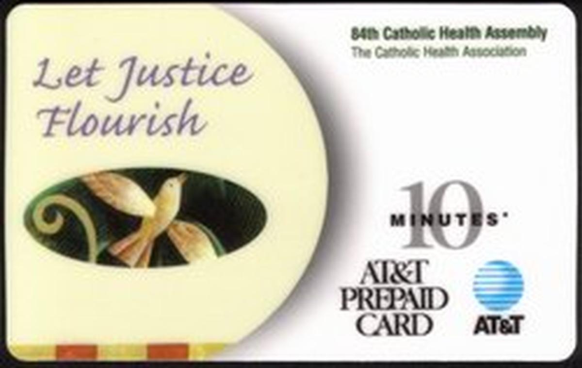 Overall, this phone card serves as a promotional collectible linked to an important event in the Catholic Health Association’s calendar, specifically the 84th Catholic Health Assembly, and reflects the values expressed by the event's theme, "Let Justice Flourish." The AT&T branding connects the card to the telecommunications provider that issued it.
