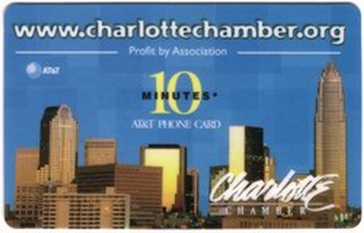 The logo and name "Charlotte Chamber of Commerce" appear on the card, along with the web address charlottechamber.org. The card is marked with a denomination of 10M. The name “AT&T” is present, indicating the issuing telecommunications company. The card is a specimen example connected to the Charlotte Chamber of Commerce, reflecting business and promotional use linked to the city of Charlotte, North Carolina.
