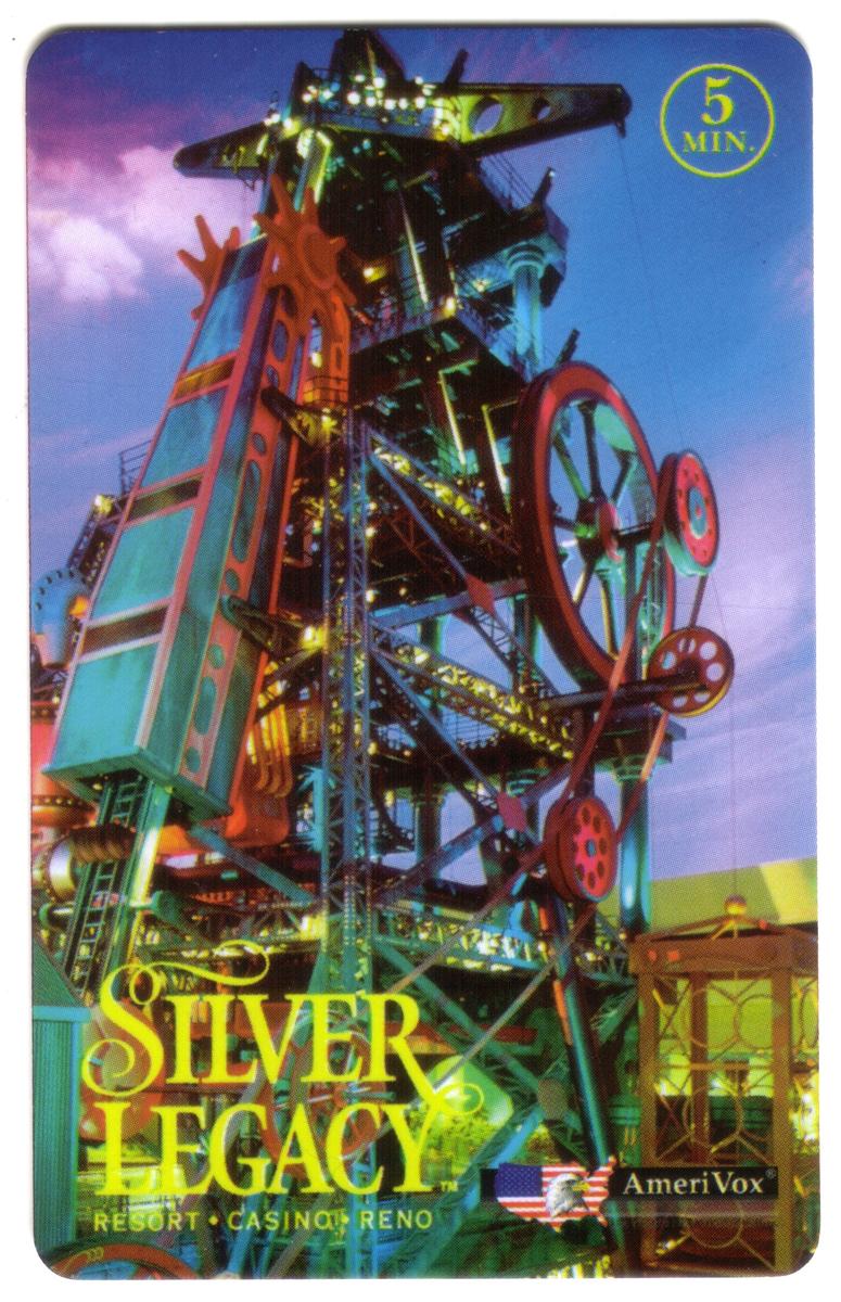 The card design includes the Silver Legacy Resort & Casino name clearly indicated, alongside additional elements that highlight its association with gambling, hotels, motels, casinos, and resorts. The branding "AmeriVox" is also present, linking the card to the producer or distributor. The design and text reinforce the card's function as a promotional item connected to the casino and resort industry in Reno.