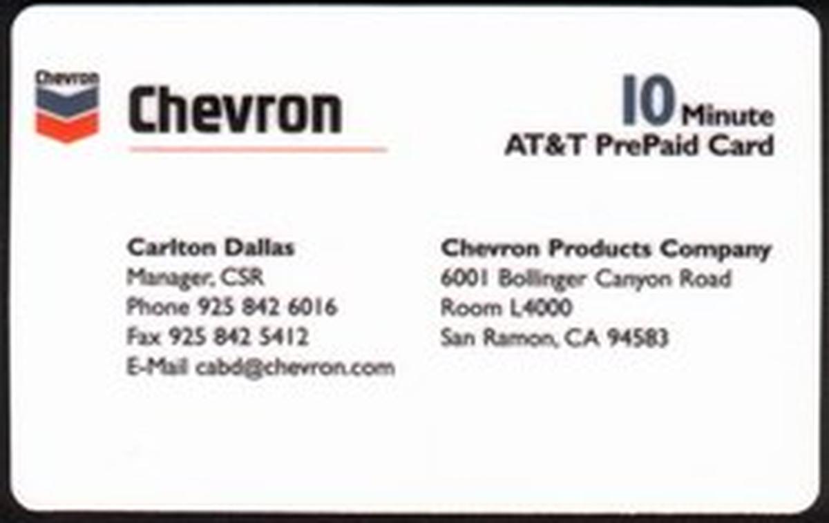 The card includes clear branding elements and names associated with the Chevron fuel and service station business. It also shows the AT&T logo, linking this specimen to telecommunications. The card’s design is professional and business-oriented, combining corporate identity from Chevron and its service operations with telecommunication branding from AT&T.
