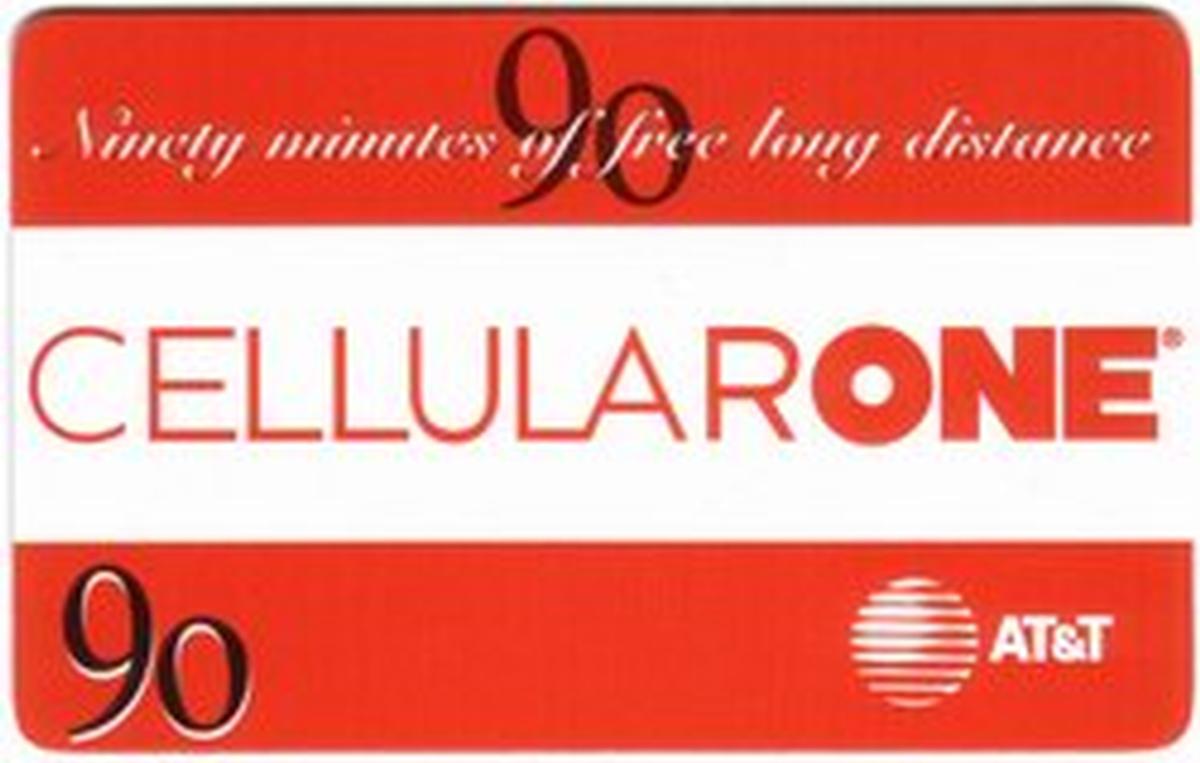 Printed near the bottom are the words "Ninety Minutes of Free Long Distance," clearly indicating a promotional offer tied to the use of the card. The top right corner contains the Cellular One logo, alongside the AT&T brand name, linking the card to these telecommunications companies. Additional text includes "Cellular One 90m," referencing the card’s value or usage time.
