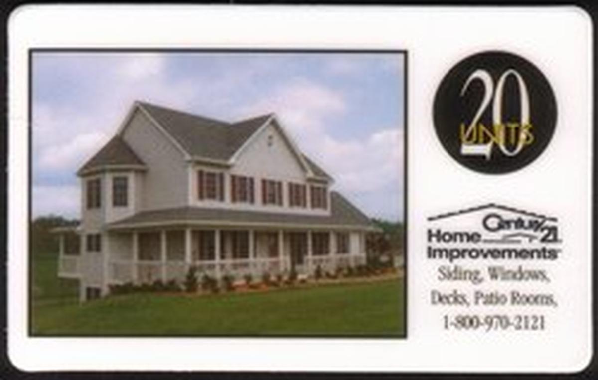 This collectible phone card features promotional branding for 20th Century 21 Home Improvements, highlighting services such as siding, windows, decks, and patio rooms. The card prominently displays the Century 21 logo in the lower right corner, along with the phrase “20u Century 21 Home Improvements” situated near the center, indicating it is tied to residential property enhancements. The design includes a subtle depiction of a house with a modern exterior, emphasizing the home improvement theme.