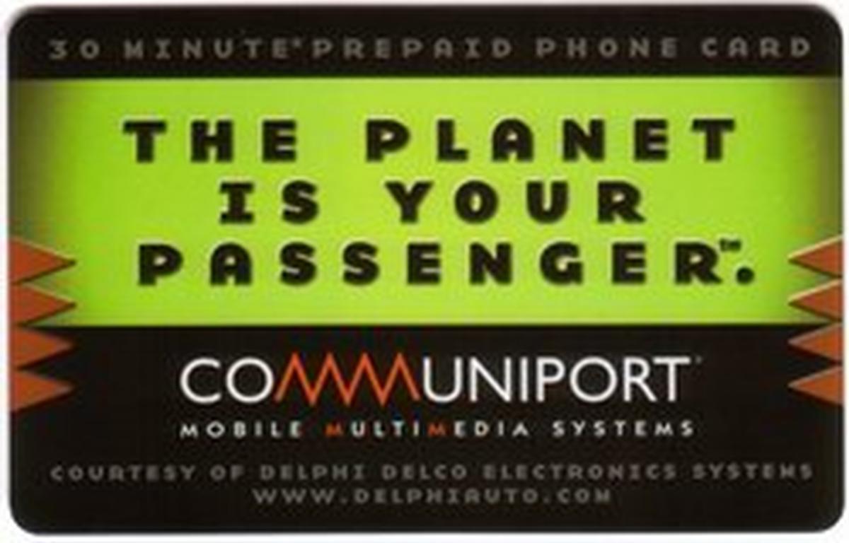 This collectible phone card features a design centered around the phrase "the planet is your passenger" prominently displayed across the card. The background illustration shows stylized depictions of the Earth with its continents and oceanic areas clearly visible. Above this imagery, the name "Delphi Delco Electronics Systems" is printed, indicating a connection to the company known for mobile communication technology. The card also references "30m Communiport Mobile Multimedia Systems," highlighting a specific product or service related to mobile multimedia.
